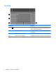 TouchPad Componente 4 Descripción (1) Indicador de desactivación del TouchPad Activa y desactiva el TouchPad. Puntee rápidamente dos veces en el indicador de desactivación del TouchPad para activar y desactivar el Touchpad. (2) Área del TouchPad Permite mover el puntero y seleccionar o activar elementos en la pantalla. (3) Botón izquierdo del TouchPad Funciona igual que el botón izquierdo de un mouse externo.