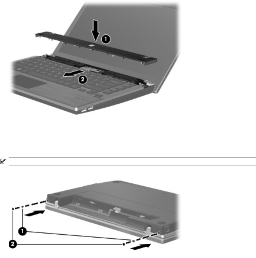 13. Vratite 2 vijka (1) i njihove pokrove (2) na stražnji rub računala.