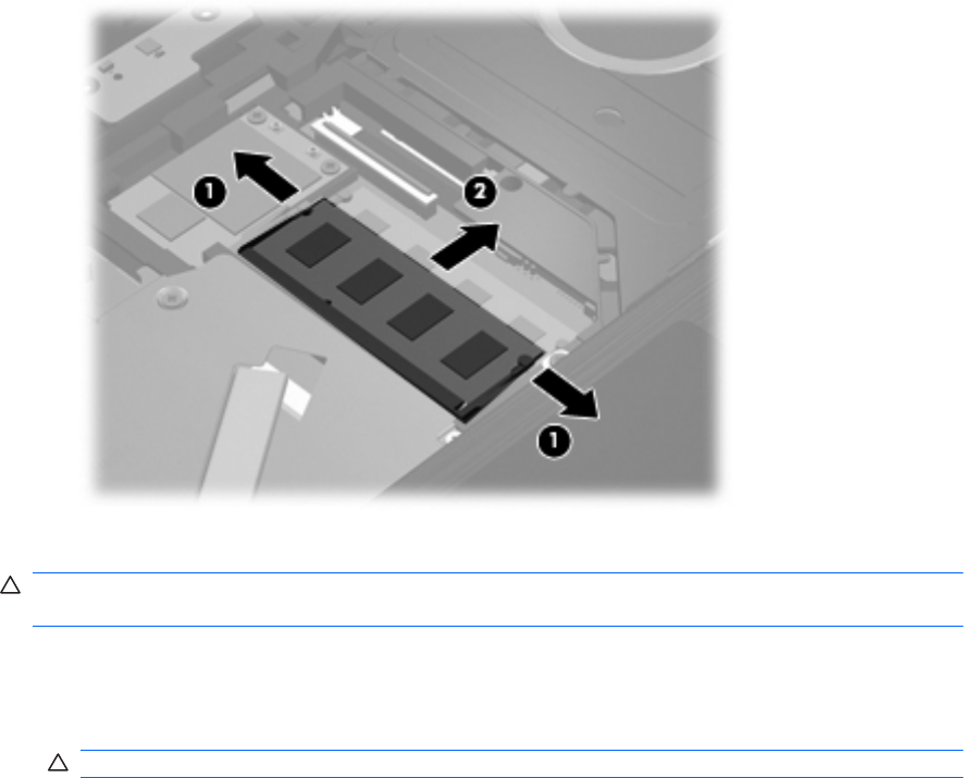 b. Uhvatite rub memorijskog modula (2) i lagano povucite modul iz utora za memorijski modul.
