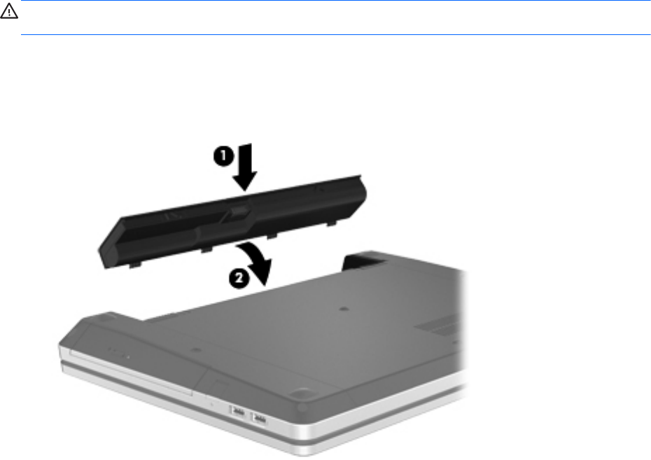 Aseta akun kielekkeet tietokoneessa olevia koloja vasten, aseta akku akkupaikkaan (1) ja kierrä