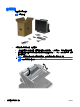組裝硬體 1. 取出所有包裝內容物。 圖示 2 套件內容 2. 將電源線接上電源供應器(如有需要) a. 將觸控螢幕傾斜至水平位置,讓裝置正面朝下放在柔軟、清潔的乾布上,避免刮傷觸控螢幕。 b.