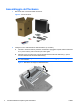 Assemblaggio dell'hardware 1. Rimuovere tutto il contenuto dalla confezione. Figura 2 Contenuto del kit 2. Collegare il cavo di alimentazione all'alimentazione (se richiesto). a. Inclinare lo schermo tattile in posizione orizzontale e appoggiare la parte anteriore dell'unità su un panno soffice, pulito e asciutto per evitare graffi. b. Allentare la vite che assicura il supporto dell'alimentatore alla base dell'unità (1), quindi scorrerlo lateralmente ed estrarlo dall'unità (2).