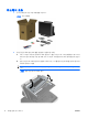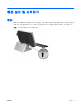 하드웨어 조립 1. 상자 안에 들어 있는 모든 내용물을 꺼냅니다. 그림 2 키트 내용물 2. 전원 공급 장치에 전원 케이블을 연결합니다(필요한 경우). a. 터치 스크린이 수평이 될 때까지 뒤로 완전히 기울인 다음, 터치 스크린에 흠집이 생기지 않 도록 부드럽고 깨끗한 마른 천 위에 터치 스크린이 아래를 향하게 하여 장치를 올려 놓습니 다. b. 전원 공급 장치 브래킷을 장치 밑면에 고정시키는 나사를 풀고 (1) 브래킷을 옆으로 밀어 장 치에서 분리합니다(2). 주: 전원 공급 장치 브래킷 나사는 완전히 풀어도 브래킷에 걸려 빠지지 않도록 설계되었습 니다.