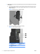 3. Sambungkan semua komponen perangkat keras periferal ke soket I/O di bagian bawah dan bagian samping layar. a. Jika menyambungkan periferal ke soket I/O bagian samping, lepaskan penutup I/O kecil di bagian samping dengan menarik keluar bagian tengah penutup (1), lalu memutar penutup hingga terlepas (2). Gambar 6 Melepas Penutup I/O Bagian Samping b. Sambungkan periferal ke soket I/O bagian samping.