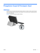 c. Jika menyambungkan periferal ke soket I/O di bagian bawah layar, lepaskan penutup I/O dengan menekan kedua tab di bagian atas penutup (1), lalu memutar penutup hingga terlepas (2). Gambar 8 Melepas Penutup I/O Bagian Bawah d. Rutekan kabel periferal melalui bagian bawah dudukan hingga keluar dari lubang di bagian atas dudukan sebelum membuat sambungan.
