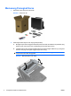 Memasang Perangkat Keras 1. Keluarkan semua komponen dari kotak. Gambar 2 Komponen Kit 2. Sambungkan kabel daya ke catu daya (jika diperlukan). a. Miringkan layar sentuh hingga berada pada posisi horizontal, lalu letakkan unit pada kain yang lembut, bersih, dan kering untuk menghindari goresan pada layar sentuh. b. Lepaskan sekrup yang mengencangkan braket catu daya ke bagian bawah unit (1), lalu geser braket ke samping dan angkat hingga terlepas dari unit (2).