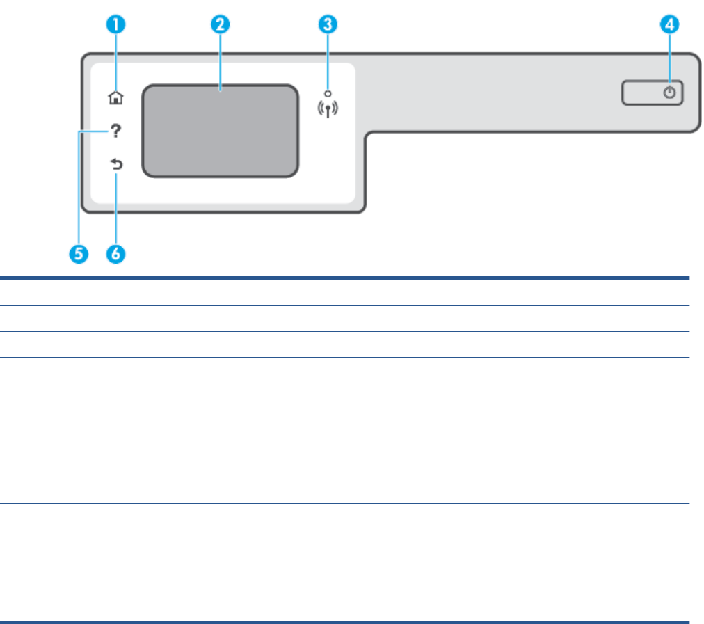 Järgmine skeem ja selle juurde kuuluv tabel annavad kiire ülevaate printeri juhtpaneeli funktsioonidest.