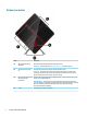 Бөлік (3) Сипаттама Сымсыз байланыс шамы ● Өшірулі: компьютер өшірулі немесе күту күйінде. Күту күйі — ең аз мөлшерде қуат тұтынатын қуатты үнемдеу күйі. ● Қосу: Сымсыз жергілікті желі (WLAN) құрылғысы және/немесе Bluetooth® құрылғысы сияқты бекітілген сымсыз құрылғы қосулы. ● Өшірулі: Барлық кірістірілген сымсыз құрылғылар өшірулі. ЕСКЕРТПЕ: Кейбір өнімдерде барлық сымсыз құрылғылар өшірулі болғанда, сымсыз байланыс шамы сары түспен жанып тұрады.