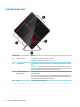 Komponentti (3) Kuvaus Langattoman yhteyden merkkivalo ● Valo ei pala: tietokoneen virta on katkaistu tai tietokone on horrostilassa. Horrostila on virransäästötila, jossa käytetään mahdollisimman vähän virtaa. ● Päällä: sisäinen langaton verkkolaite, esimerkiksi langaton lähiverkkolaite (WLAN) ja/tai Bluetooth®-laite, on toiminnassa. ● Valo ei pala: kaikista liitetyistä langattomista laitteista on katkaistu virta.