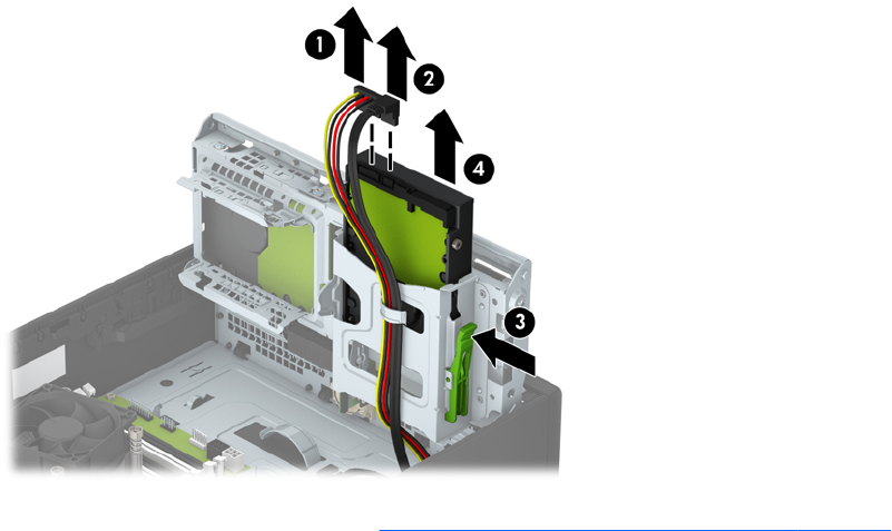 8. Atjunkite maitinimo (1) ir duomenų perdavimo laidus (2) nuo standžiojo diskų įrenginio galinės dalies.
