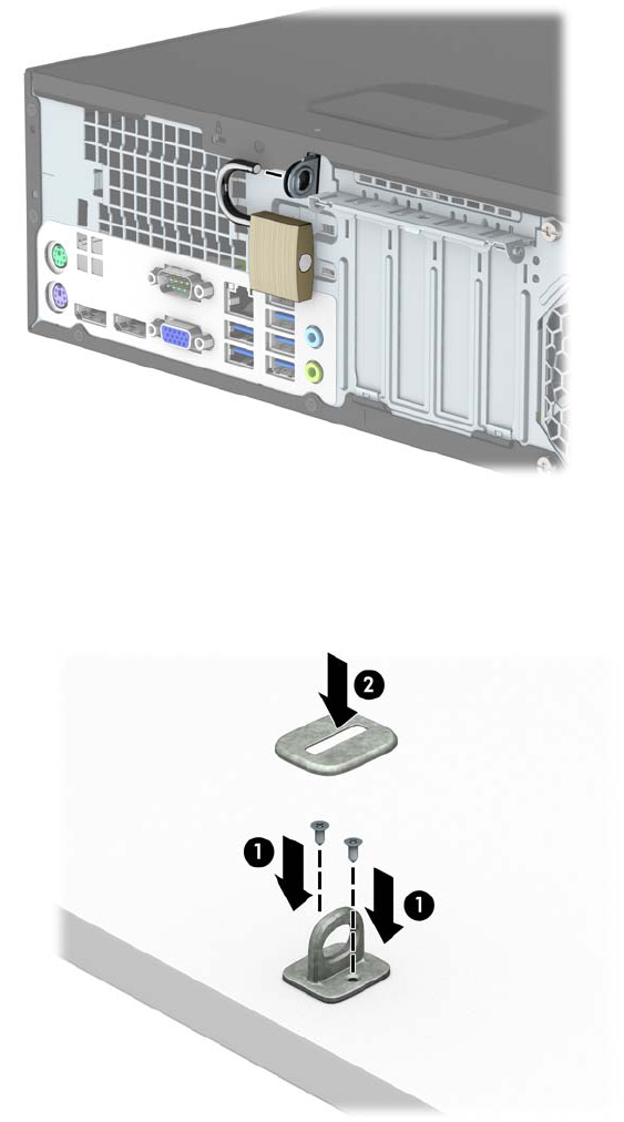 1. Apsauginio kabelio tvirtinimo detalę tinkamais varžtais (įsigyjami atskirai) (1) pritvirtinkite prie darbo