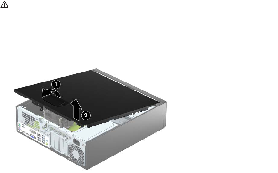 6. Поднимите рукоятку защитной панели (1), затем снимите защитную панель с компьютера (2).