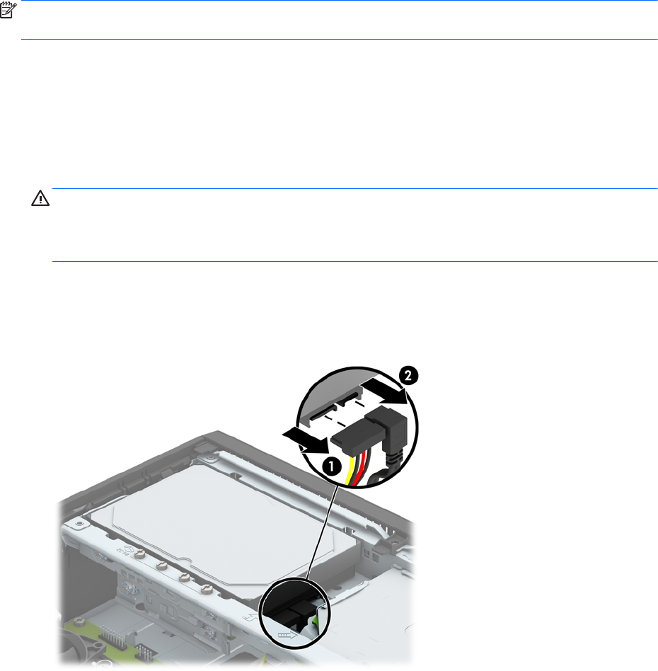 7. Отключите кабель питания (1) и кабель данных (2) от тыльной стороны жесткого диска.