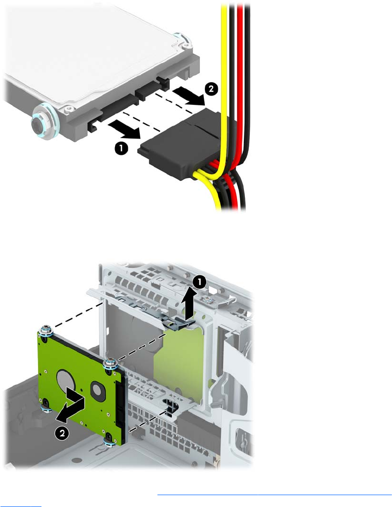 8. Отключите кабель питания (1) и кабель данных (2) от тыльной стороны жесткого диска.