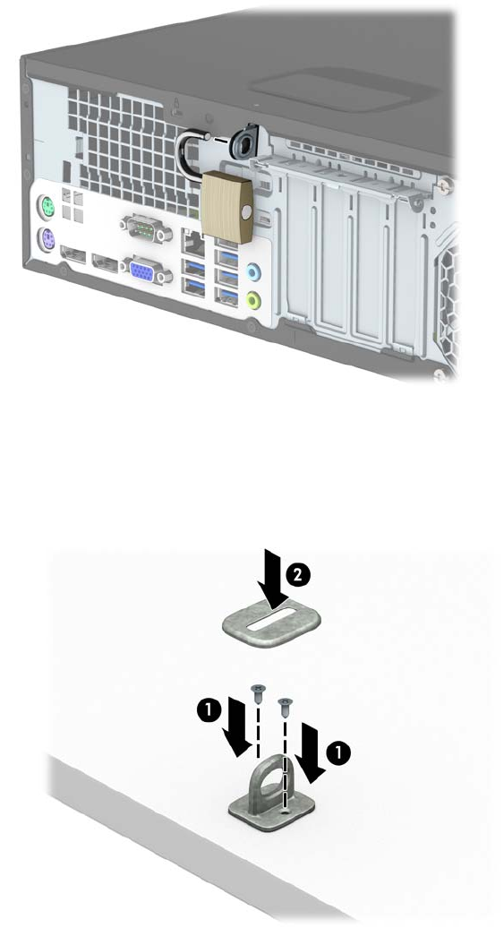 1. Прикрепите фиксатор тросика замка к рабочему столу с помощью соответствующих винтов