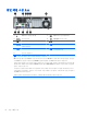- 뒷면 패널 구성 요소 1 PS/2 마우스 연결단자(녹색) 7 PS/2 키보드 연결단자(자주색) 2 직렬 연결단자 8 DisplayPort 모니터 커넥터 3 RJ-45 네트워크 연결단자 9 VGA 모니터 연결단자 4 S4/S5 에서 절전 모드 해제 기능이 있는 USB 3.0 포트(파란색) 10 USB 3.0 포트(파랑) 5 오디오 입력 라인 연결단자(파란색) 11 전원을 사용하는 오디오 장치용 출력 라 인 연결단자(녹색) 6 전원 코드 연결단자 참고: 연결단자의 배열 및 개수는 모델에 따라 다를 수 있습니다. USB 키보드를 사용할 경우 S4/S5 에서 절전 모드 해제 기능이 있는 USB 3.0 포트 중 하나에 키보드를 연결하는 것이 좋습 니다. S4/S5 에서 절전 모드 해제 기능은 F10 BIOS 설정에서 활성화된 경우 PS/2 커넥터에서도 지원됩니다.