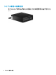 横置きから縦置きへの変更 お使いの省スペース型コンピューターは、HP から購入できるオプションの縦置き用スタンドを利用す れば、縦置き構成でも使用できます。 1. コンピューターが開かれないように保護しているセキュリティ デバイスをすべて取り外します。 2. CD や USB フラッシュ ドライブなどのすべてのリムーバブル メディアをコンピューターから取 り出します。 3. オペレーティング システムを適切な手順でシャットダウンしてコンピューターの電源を切って から、外付けデバイスの電源もすべて切ります。 4. 電源コードを電源コンセントから抜き、コンピューターからすべての外付けデバイスを取り外し ます。 重要:システムが電源コンセントに接続されている場合、電源が入っているかどうかに関係な く、システム ボードには常に電気が流れています。感電やコンピューターの内部部品の損傷を防 ぐため、必ず電源コードをコンセントから抜いてください。 5.