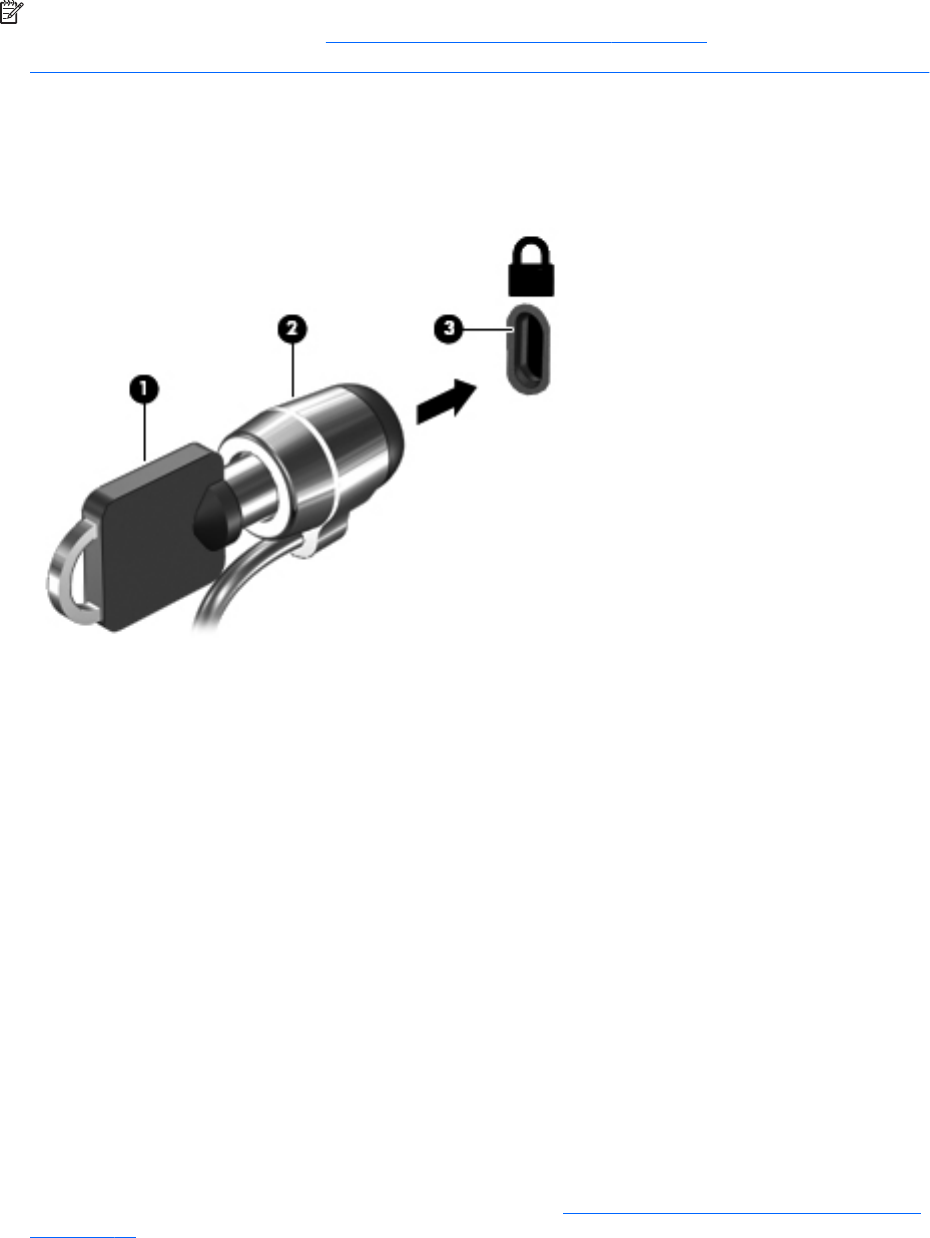 3. Steek het kabelslot in het slot voor de beveiligingskabel op de computer (3) en vergrendel het kabelslot