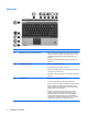 Wskaźniki Element Opis (1) ● Świeci: wbudowane urządzenie bezprzewodowe, takie jak urządzenie bezprzewodowej sieci lokalnej (WLAN), moduł HP Mobile Broadband i/lub urządzenie Bluetooth®, jest włączone. ● Bursztynowy: Wszystkie urządzenia bezprzewodowe są wyłączone. ● Świeci: Komputer jest włączony. ● Miga: Komputer jest w stanie wstrzymania. ● Szybko miga: Należy podłączyć adapter prądu przemiennego o wyższej mocy znamionowej.