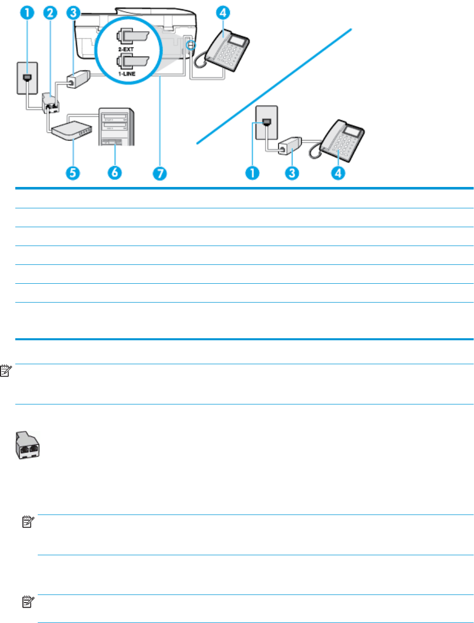 và hai cổng RJ-11 ở phía sau. Không sử dụng bộ chia điện thoại 2 đường dây, bộ chia nối tiếp hay bộ