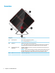 Höger sida Komponent (1) Beskrivning Strömknapp ● Slå på datorn genom att trycka på knappen. ● När datorn är påslagen aktiverar du strömsparläget genom att snabbt trycka på knappen. ● När datorn är i strömsparläge avslutar du detta genom att snabbt trycka på knappen. ● När datorn är i viloläge avslutar du detta genom att snabbt trycka på knappen. VIKTIGT: Om du håller ned strömknappen förlorar du all information som inte har sparats.