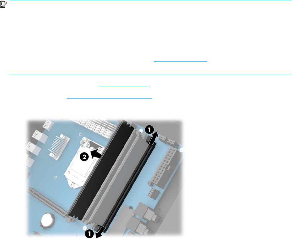 3. 如果要拆除 DIMM,请将 DIMM 每侧的锁定器向外侧按 (1),然后将 DIMM 从插槽中拔出 (2)。