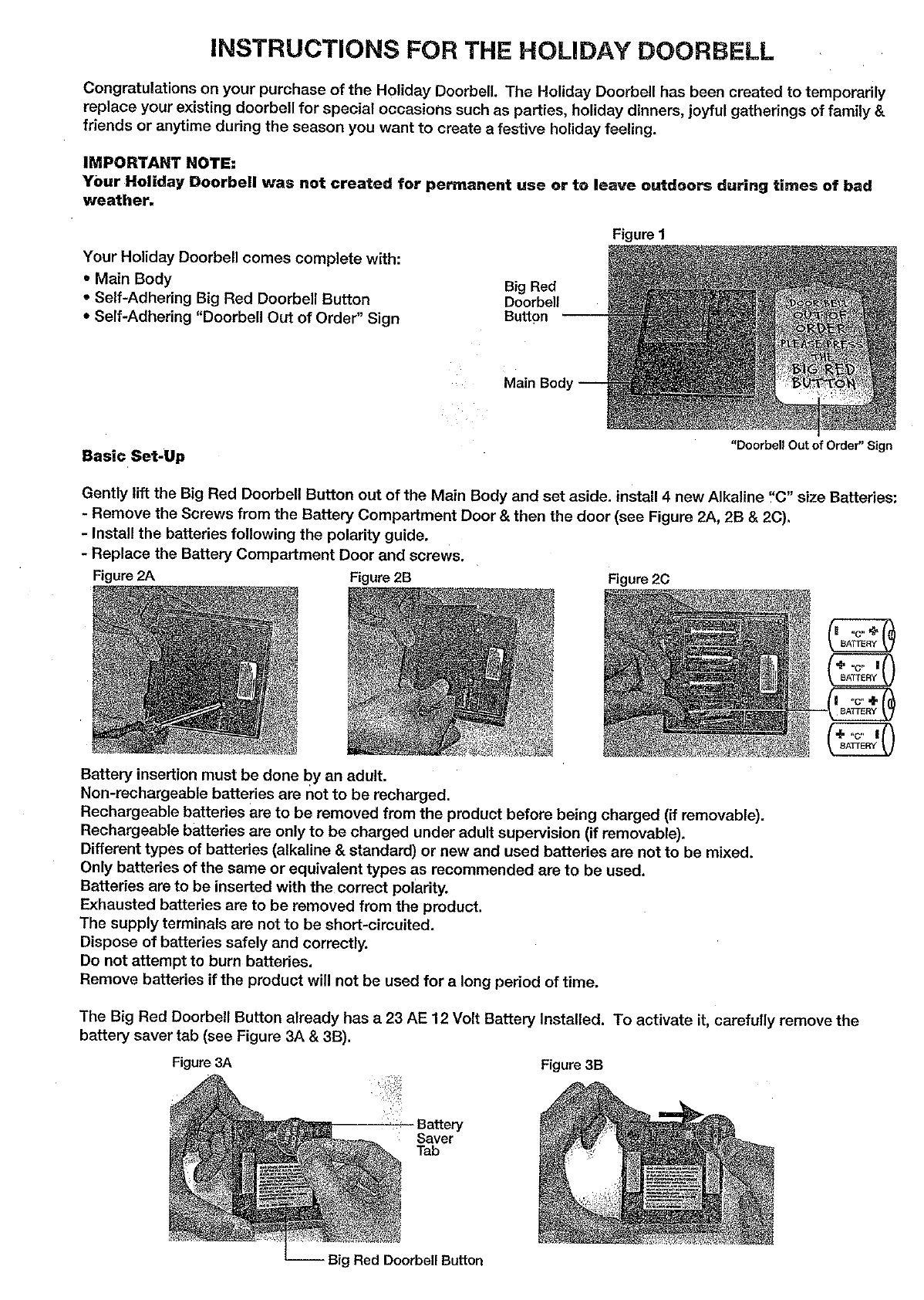 INSTRUCTIONS FOR THE HOLIDAY DOORBELL Congratulations on your purchase of the Holiday Doorbell, The Holiday Doorbell has been created to temporarily replace your existing doorbell for special occasions such as parties, holiday dinners, joyful gatherings of family & friends or anytime during the season you want to create a festive holiday feeling. IMPORTANT NOTE: Your Holiday Doorbell was not created for permanent use or to leave outdoors during times of bad weather.