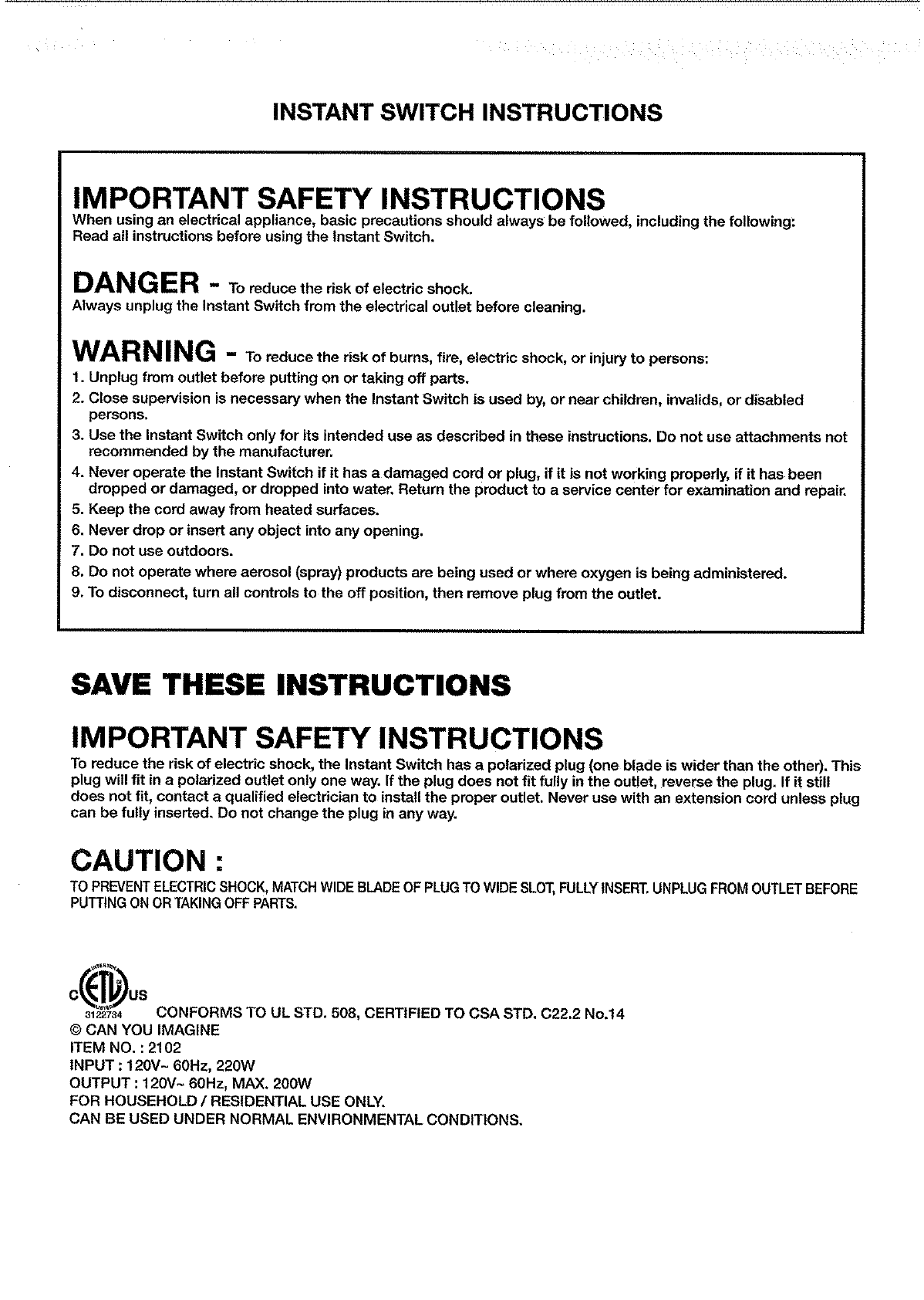 INSTANT SWITCH INSTRUCTIONS IMPORTANT SAFETY INSTRUCTIONS When using an electrical appliance, basic precautions should always be followed, including the following: Read all instructions before using the instant Switch, DANGER = To reduce the risk of electric shock. Always unplug the instant Switch from the electrical outlet before cleaning. WARNING = To reduce the risk of burns, fire, electric shock, or injury to persons: 1. Unplug from outlet before putting on or taking off parts. 2.
