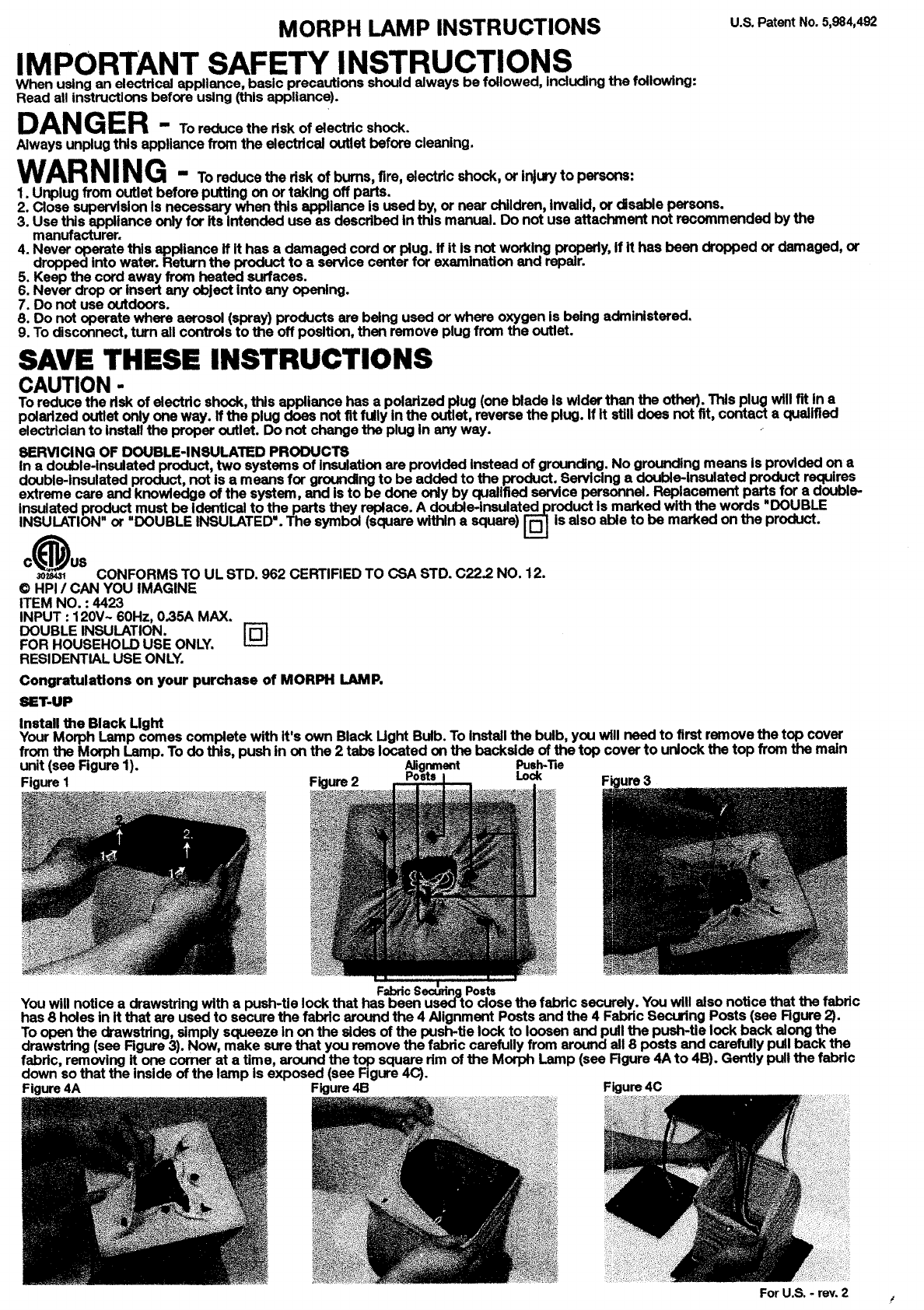 MORPH LAMP INSTRUCTIONS Us. Patent No 5,084,492 IMPORTANT SAFETY INSTRUCTIONS When using an electrical appliance, basic precautions should always be followed, Including the following: Read all instructions before using {this appliance). DANGER * To reduce the risk of electric shock. Always unplug this appliance from the electrical outlet before cleaning. WARN NG = To reduce the risk of burns, fire, electric shock, or Injury to persons: 1. Unplug from outlet before putting on or taking off pairs.