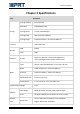SP320 User Manual Chapter 2 Specifications Items Printing Parameter Printing method Direct thermal Resolution 203dpi(8dots/mm) Printing speed 4 levels, Max.180mm/s Printing width Max.3.54 inches (80mm) Printing length 0.984 inch(25mm) ~11.