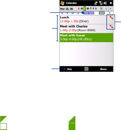 By default, Calendar displays appointments in Agenda view. You can also look at your appointments in Day,