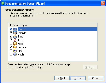 a USB connection, it starts the ActiveSync Synchronization Setup Wizard. Follow the instructions