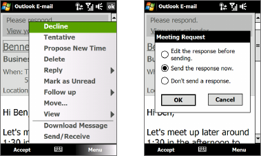 2. Tap Accept to reply and accept the meeting request, or tap Menu >
