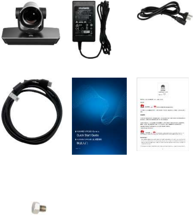 Packing List Power cable (1) Camera (1) Power adapter (1) HDMI cable (1) Quick Start Guide (1) Note: The HDMI cable is used to connect the camera's HDMI port and a videoconferencing endpoint. Note: Power cables may vary between countries. Certificate of Compliance & Safety Precautions & Warranty Card (1) 1/4"-20UNC-7 mm Inch screw (1) Used to fix a support. http://e.huawei.com Issue: 02 (2015-08-08) Copyright © Huawei Technologies Co., Ltd. 2015. All rights reserved.