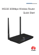 1 Obtaining More Information Thanks for purchasing the WS330 300Mbps Wireless Router (WS330 for short). This quick start will show you how to connect your WS330 to a network and access the Internet. The figures in this guide are for reference only. The appearance and display features may vary slightly depending on the actual product version. For the full user guide, visit http://www.huaweidevice.com. Enter WS330 in the website search box and press Enter. Please visit www.huaweidevice.