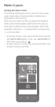 Getting to know your phone From any screen, you can: • To return to the previous screen or exit the current • • • • • . application, tap To view running applications, tap and hold . To return to the Start screen, tap . To open the voice controller, tap and hold . To open Bing, tap . To take a screenshot, press the power button and tap simultaneously.