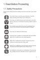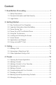 Content 1 Read Before Proceeding .....................................................1 1.1 Safety Precautions....................................................................... 1 1.2 Personal Information and Data Security ...................................... 2 1.3 Legal Notice................................................................................. 3 2 Getting Started.....................................................................6 2.1 2.2 2.3 2.4 2.5 2.6 2.7 2.8 2.