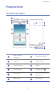 Preparations Preparations Your phone at a glance 1 11 2 3 4 10 12 9 13 5 8 6 7 14 15 16 — 1 Noise reduction microphone 2 Micro-SIM card slot 3 Earpiece 4 Status indicator 5 microSD card slot 6 Screen 7 Volume button 8 Power button 9 Front camera 10 11 Headset jack 12 3 Proximity sensor/RGB light sensor Rear camera
