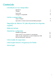 Conteúdo Introdução ao seu computador Aparência Teclado Painel tátil Carregar o computador 1 3 4 6 Iniciar o computador Ligar e desligar Aproveitar o máximo das funcionalidades principais 8 8 Reposição de fábrica F10 (não disponível em algumas regiões) Modo de leitura Acessórios e extensões MateDock (opcional) Ligar a uma TV, um monitor ou um projetor Ligar um rato, impressora ou outros dispositivos USB Rato por Bluetooth (opcional) 11 12 14 14 Informações de segurança Informação Pessoal e Segurança d