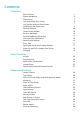 Contents Essentials Basic Gestures System Navigation Phone Clone Lock and Unlock Your Screen Get Familiar with the Home Screen Notification and Status Icons Shortcut Switches Home Screen Widgets Set Your Wallpaper Screenshots&Screen Recording View and Clear Notifications Adjust Sound Settings Enter Text Split-screen Mode and Floating Window Power On and Off or Restart Your Device Charging 1 4 5 6 7 8 10 10 10 11 15 16 17 17 19 19 Smart Features AI Lens Easy Projection Multi-screen Collaboration Huawei Sha