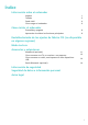 Índice Información sobre el ordenador Aspecto Teclado Panel táctil Cómo cargar el ordenador 1 2 4 6 Cómo iniciar el ordenador Encendido y apagado Aprovecha al máximo las funciones principales 8 8 Restablecimiento de los ajustes de fábrica F10 (no disponible en algunas regiones) Modo Lectura Accesorios y extensiones MateDock (opcional) Cómo conectar una TV, un monitor o un proyector Cómo conectar un ratón, una impresora u otros dispositivos USB Ratón Bluetooth (opcional) 11 12 14 14 Información de segu