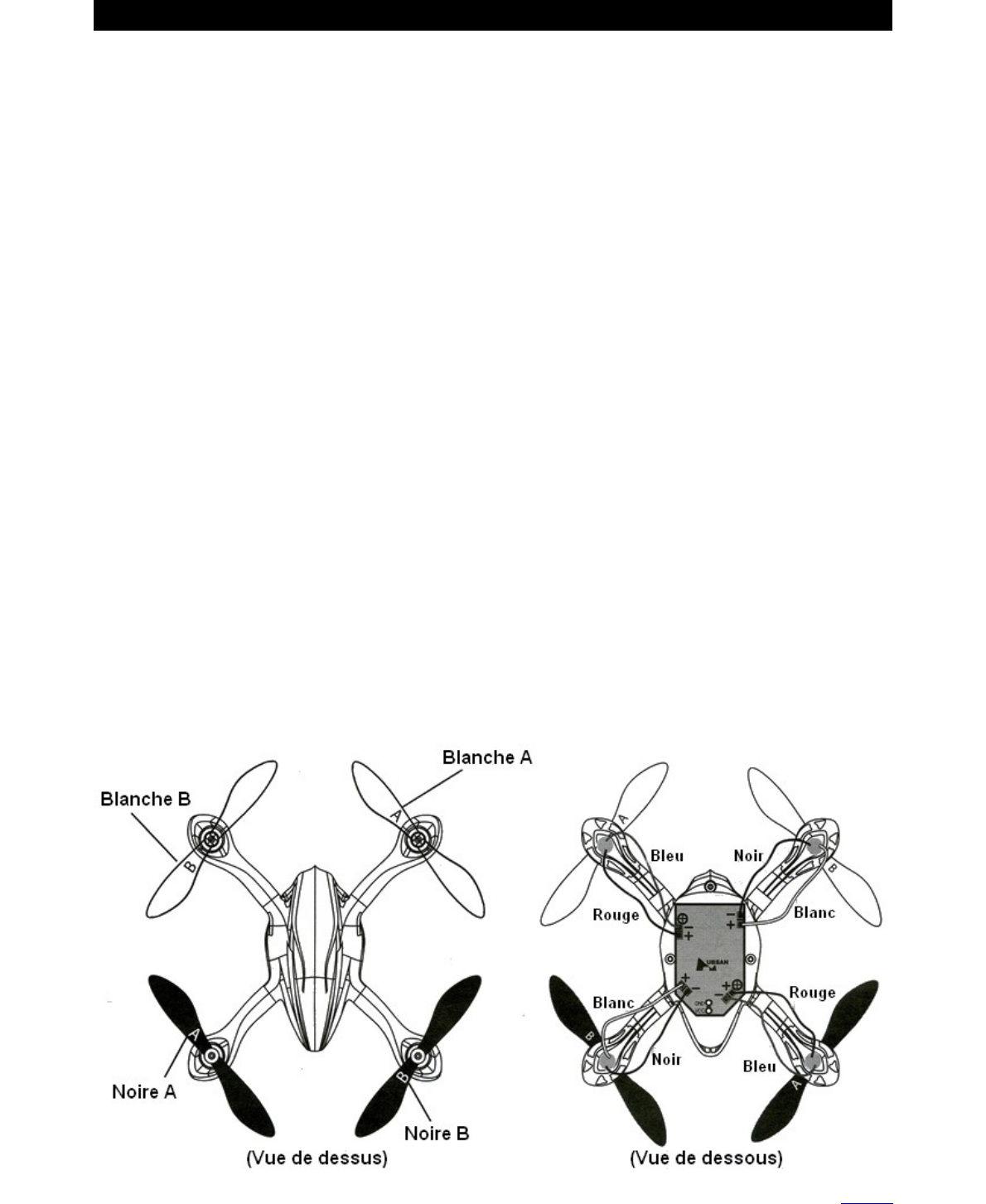 Réponse : (1) Mauvaise installation des hélices. Les hélices sont marquées ''A'' (sens horaire) et ''B'' (sens