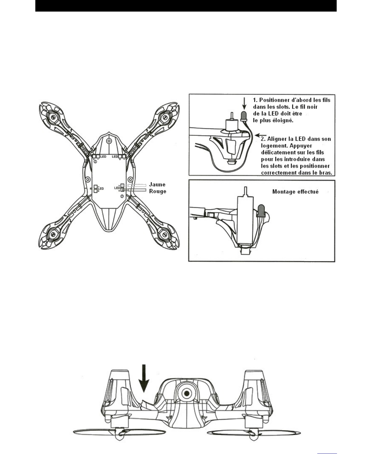 LED, ensuite les fils des moteurs dans les slots. Replacer la coque inférieure, puis les pieds amortisseurs.