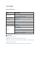 Keypad indications Number 1 Item Left Soft Key Select the option. Open Menu. Call Key 2 3 Function Make or answer calls. View calls history when standby. Right Soft Key Select the option. Enter Contacts Menu when standby. END--PWR Key 4 Hold to turn on--off. Press to end or reject a call. Return to the standby screen. Left, Right, u、Up, Down and OK. Navigation Keys 5 Left: enter Alarm Menu. Right: enter Profiles. Up: enter Messages. Down: Create new message.