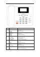 Number Item SELECT Key 1 BACK Key 2 Enter menu Confirm an option Contacts List In Menu: Back/Delete Navigation Keys EXIT Key Power on/Power off End a call Back to the idle screen 3 4 DIAL/REDIAL Key 5 MUTE Key 6 Function Left: Alarm Right: Recent Calls Up: Messages Down: Create message Recent Call Answer/Send a call Mute/Unmute during the call, the other can hear/ not hear you during the call 2
