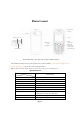 Phone Layout Harness hole Earpiece Speaker Recharge jack Mic Screen Main menu Game Calling key Earphone jack SMS Contact list Recent calls Power on/off Audio profiles Standard keypad Phone Bottom Side、Back Side and Front Side Schematic Diagram This handset has totally 20 keys on the keypad. It has 1.4 inches FSTN(or CSTN with maximum 4K colors for colorful display product)screen. Also it has a recharge interface.