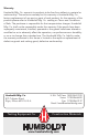 Warranty Humboldt Mfg. Co. warrants its products to be free from defects in material or workmanship. The exclusive remedy for this warranty is Humboldt Mfg. Co., factory replacement of any part or parts of such product, for the warranty of this product please refer to Humboldt Mfg. Co. catalog on Terms and Conditions of Sale. The purchaser is responsible for the transportation charges. Humboldt Mfg. Co.