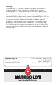 Warranty Humboldt Mfg. Co. warrants its products to be free from defects in material or workmanship. The exclusive remedy for this warranty is Humboldt Mfg. Co., factory replacement of any part or parts of such product, for the warranty of this product please refer to Humboldt Mfg. Co. catalog on Terms and Conditions of Sale. The purchaser is responsible for the transportation charges. Humboldt Mfg. Co.