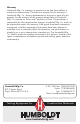 Warranty Humboldt Mfg. Co. warrants its products to be free from defects in material or workmanship. The exclusive remedy for this warranty is Humboldt Mfg. Co., factory replacement of any part or parts of such product, for the warranty of this product please refer to Humboldt Mfg. Co. catalog on Terms and Conditions of Sale. The purchaser is responsible for the transportation charges. Humboldt Mfg. Co.