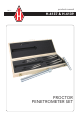 General The Proctor Penetrometer is used in method of test for establishing the moisture penetration resistance relations of fine-grained soils as determined by penetration testing. The Model H-4139, Proctor Penetrometer is furnished with these interchangeable needles: (in2 (cm2)) 1 (6.45), 3/4 (4.84), 1/2 (3.22), 1/3 (2.15), 1/5 (1.29), 1/10 (.65), 1/20 (0.32), 1/30 (0.22) and 1/40 (0.16). Replacement needles are available. H-4139 complies with ASTM D1558 for number and sizes of needles required.